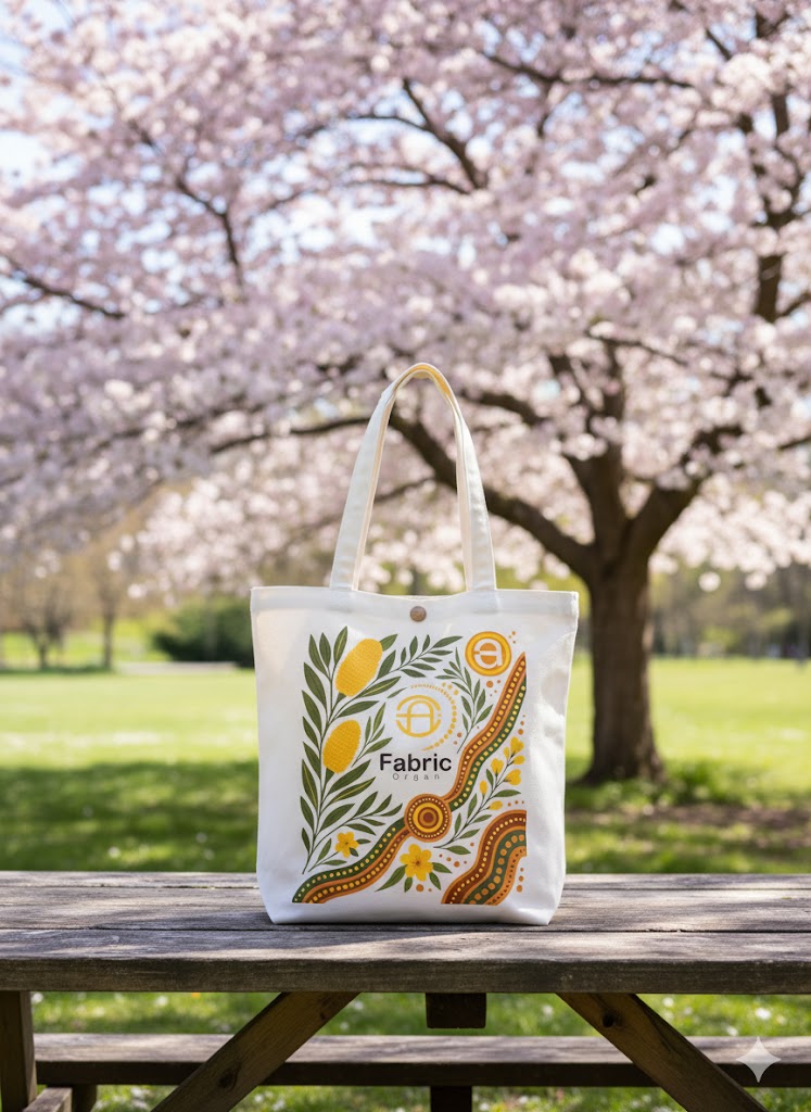 Our tote bags are thoughtfully designed by the team at Fabric Organ to honour the land of Australia, its Aboriginal people, and the country's unique native flora. Each design blends elements of traditional culture with the modern beauty of the Fabric Organ logo, creating a piece that's both stylish and deeply rooted in connection.